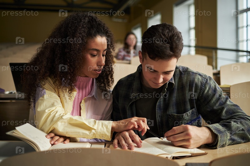 Мультиэтнические студенты университета молодых взрослых учатся вместе в лекционном зале