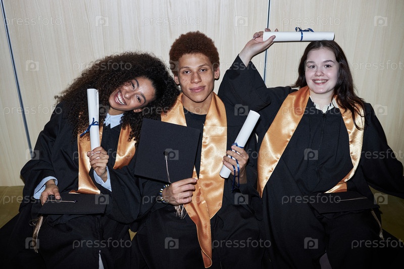 Разнообразная группа веселых молодых студентов празднуют выпуск вместе