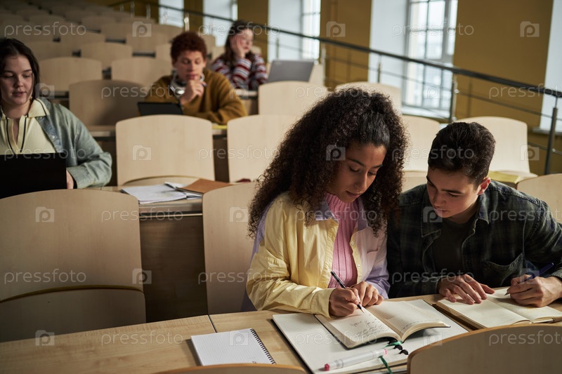 Разнообразная группа студентов университета, сотрудничающих и учащихся в лекционном зале