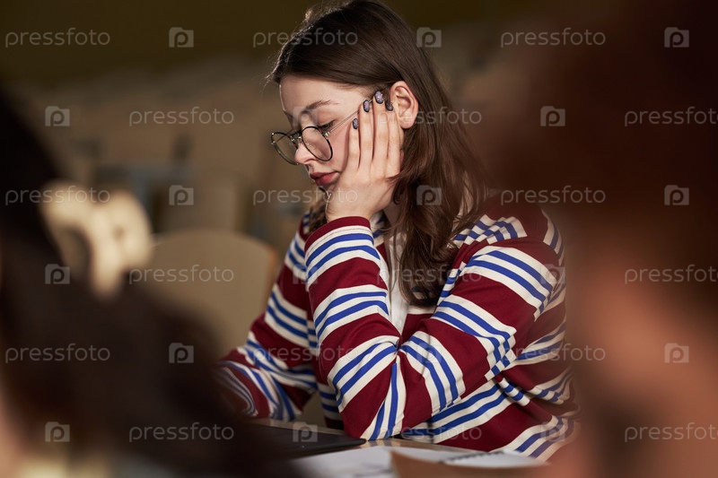 Молодая взрослая женщина учится в университетском классе во время лекции