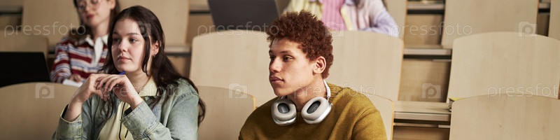 Многонациональные студенты университета внимательно слушают молодых людей во время семинара