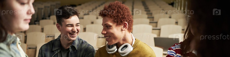 Разнообразная группа студентов университета общаются и смеются в лекционном зале