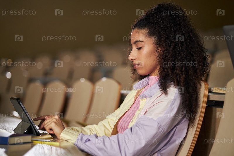 Молодая взрослая женщина учится с помощью цифрового планшета в университетском лекционном зале