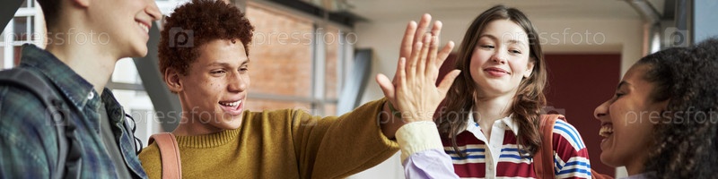 Группа разнообразных студентов университета, дающих пять и улыбающихся в помещении