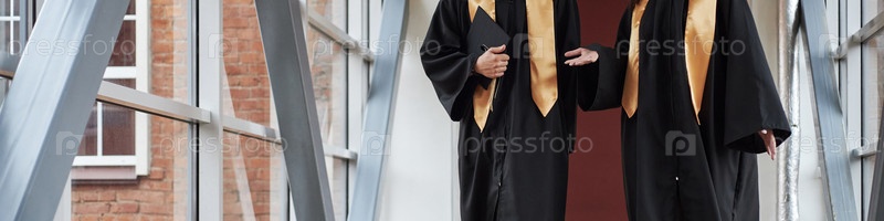 Два молодых человека в выпускных платьях разговаривают внутри дома