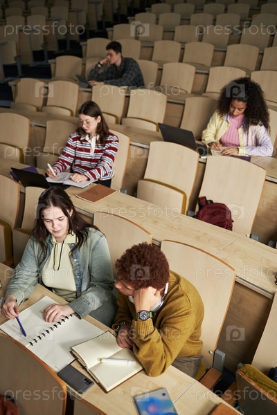 Разнообразные студенты университетов изучают и делают заметки в лекционном зале