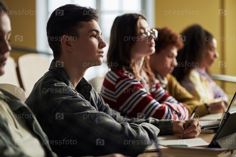Разнообразная группа студентов университета слушает и делает заметки во время лекции