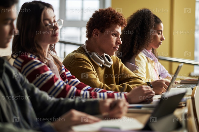 Мультиэтнические студенты молодых взрослых слушают и пишут во время университетского семинара