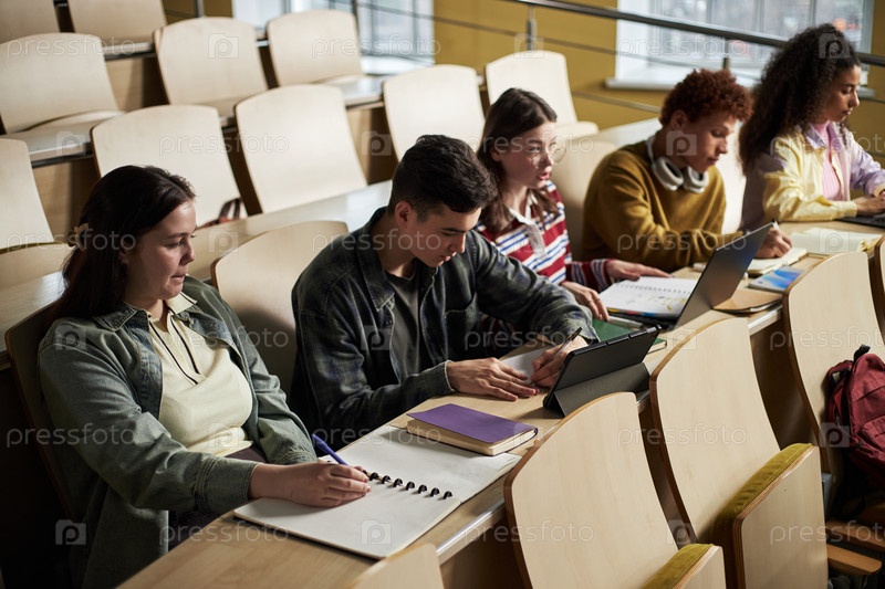 Мультиэтнические молодые взрослые студенты университета пишут заметки во время семинара в классе