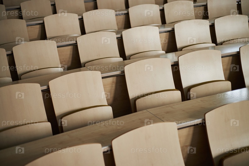 Пустые лекционные залы, сидящие места расположены в ряды и ждут студентов университета