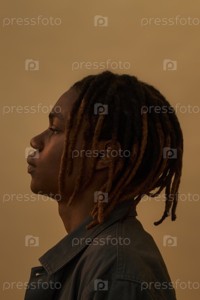 Молодой чернокожий мужчина позирует в профиле на нейтральном фоне
