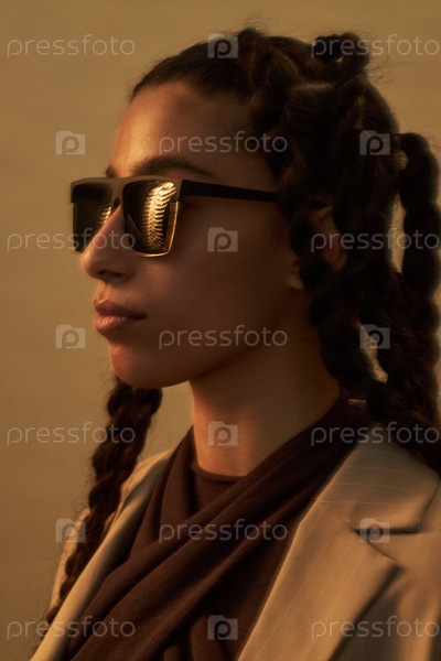 Молодая взрослая мультиэтническая женщина, носящая солнцезащитные очки, позирует в студии