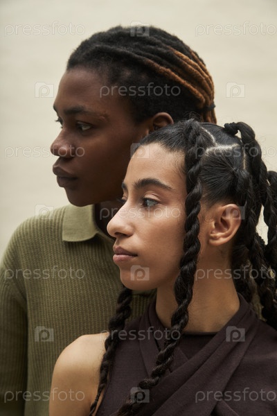 Молодые мультиэтнические взрослые стоят вместе и смотрят в сторону с серьезными выражениями лица
