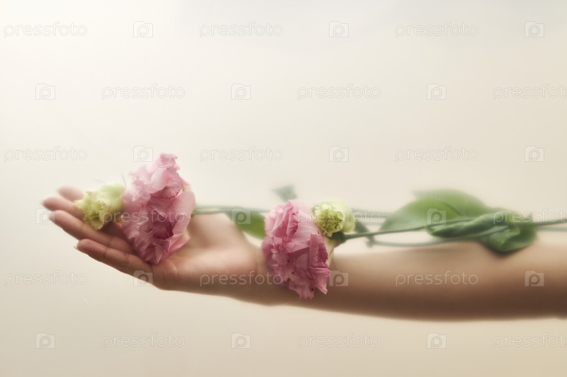 Женская рука держит розовые цветы на мягком нейтральном фоне