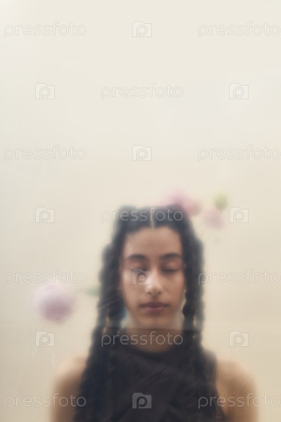 Молодая взрослая ближневосточная женщина медитирует с закрытыми глазами в помещении