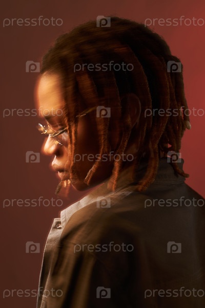 Молодой взрослый чернокожий мужчина, носящий очки, стоит в студии с драматическим освещением