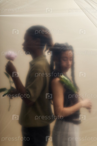 Молодой чернокожий мужчина и молодая азиатская женщина держат цветы, стоя спиной к спине