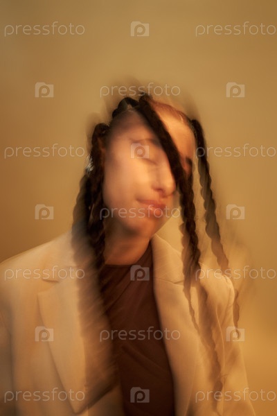 Молодая взрослая женщина движется головой с скобами в художественном размытии