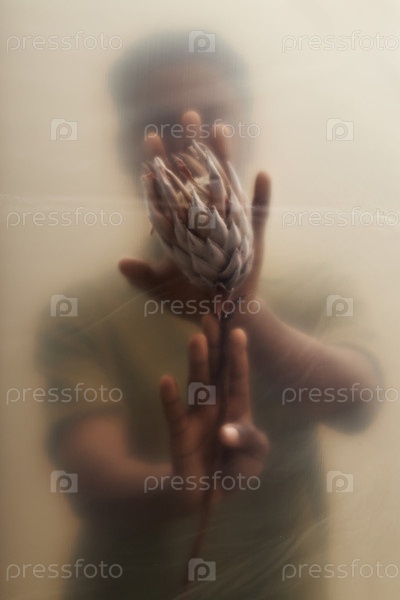 Молодой чернокожий мужчина держит цветок протеины за прозрачной поверхностью