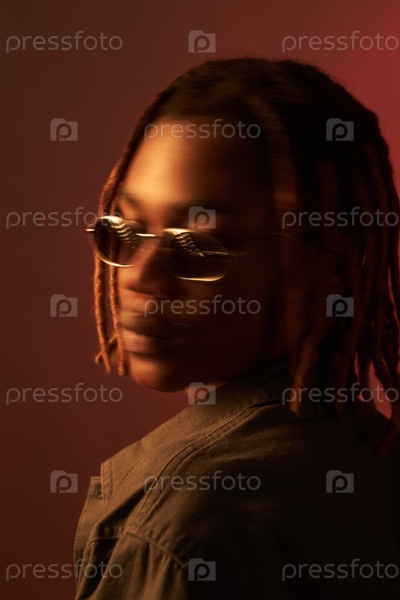 Молодая взрослая чернокожая женщина в солнцезащитных очках, поворачивающая голову при освещении студии