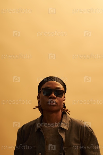 Портрет молодого взрослого чернокожего мужчины в солнцезащитных очках, смотрящего на камеру