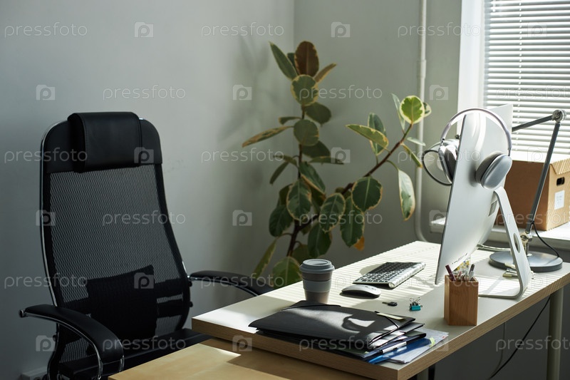 Офисное рабочее пространство с настольным компьютером и современными наушниками от Window