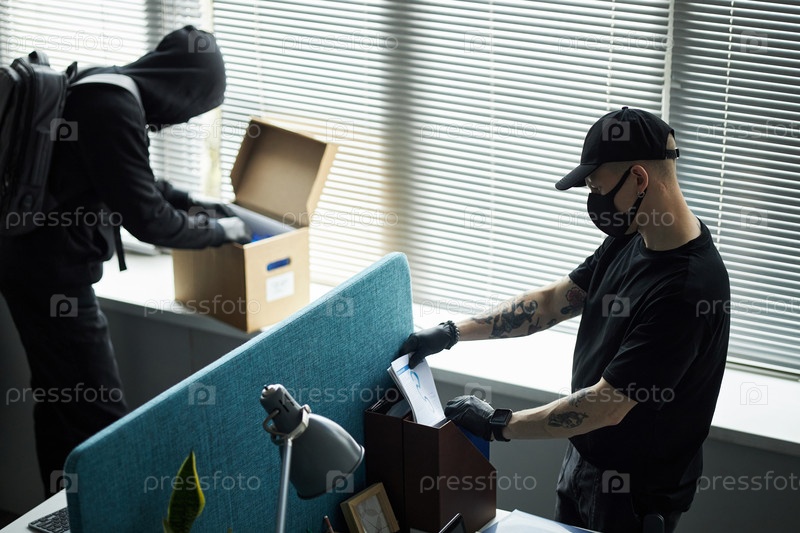 Татуированный молодой вор, носящий маску, просматривает документы в офисе
