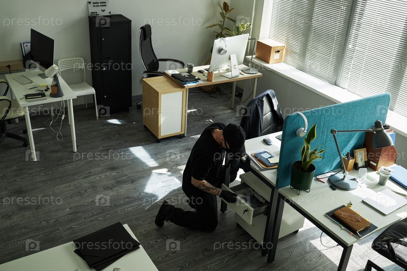 Криминальный коленопреклонение и поиск ящика в современном офисе Мужчина