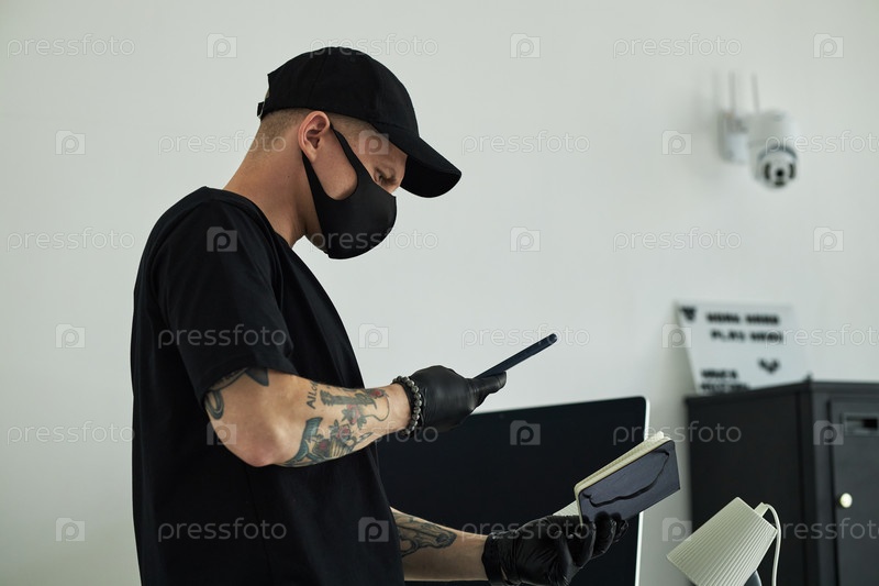 Ношение маски сканирует блокнот со смартфоном в офисе Человек