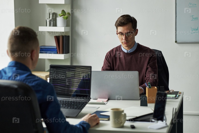 Молодые взрослые мужчины сотрудничают над проектом в современном офисном рабочем пространстве