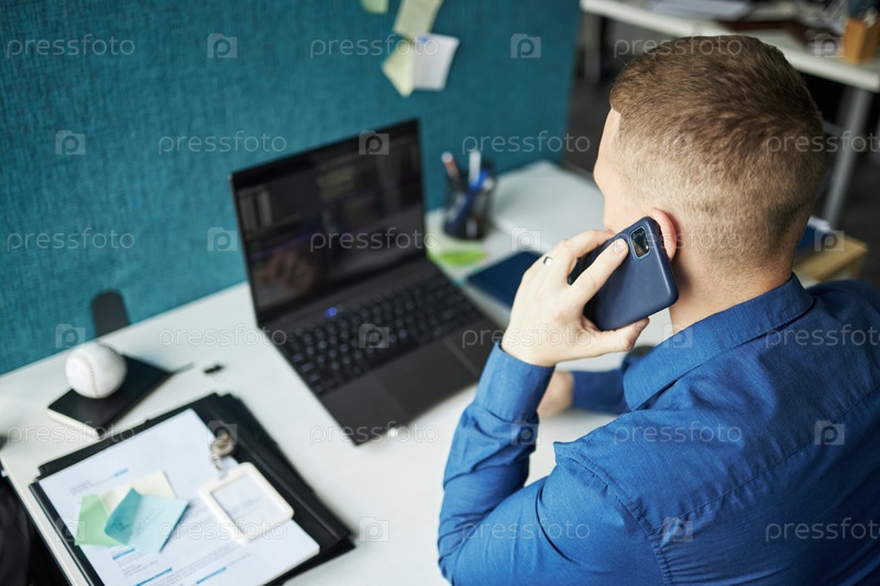 Мужчина-сотрудник работает за рабочим столом, разговаривая со смартфоном