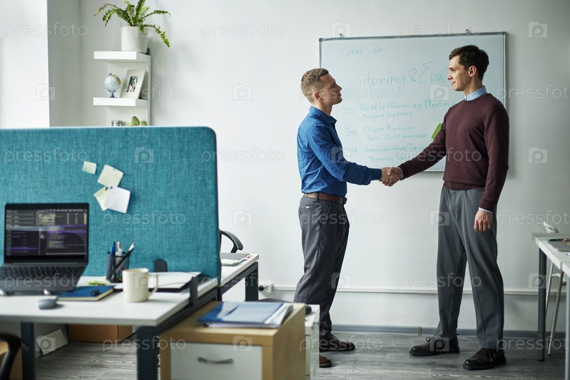 Два молодых человека, пожавшие руки во время деловой встречи в офисе