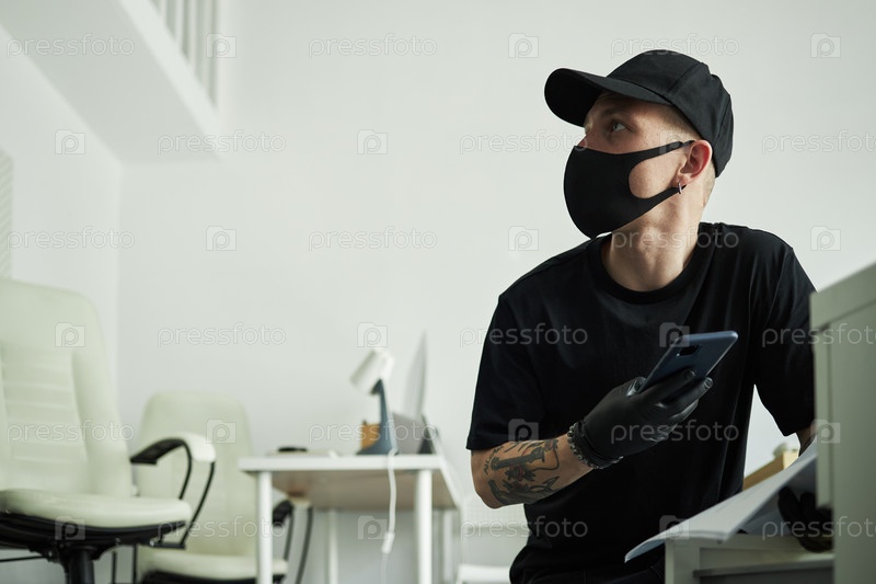 Вторгающийся носит маску и перчатки, фотографируя корпоративные документы
