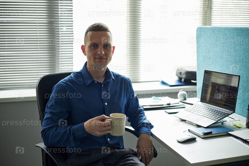 Портрет молодого человека, сидящего за рабочим столом и держащего чашку кофе
