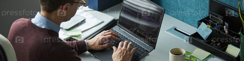 Молодой человек программирует на ноутбуке, работая в офисе