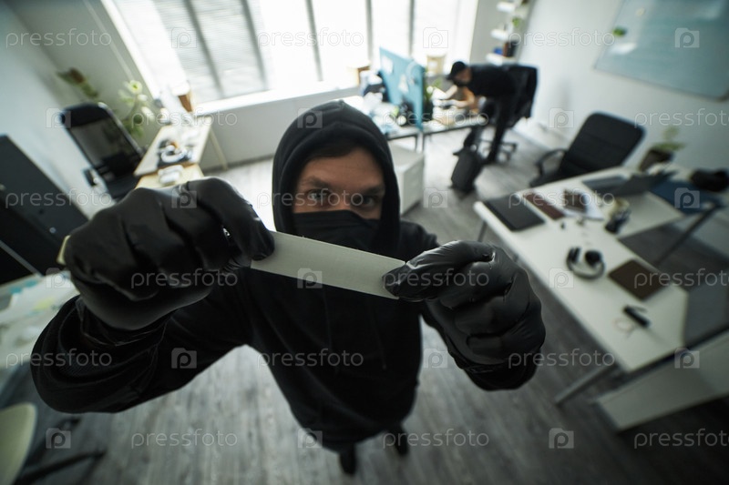 Человек, носящий маску, покрывающую камеру безопасности лентой во время ограбления офиса