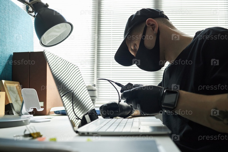 Молодой хакер с черной маской взламывает корпоративный ноутбук в офисе