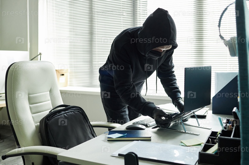 Человек, носящий маску и капюшон Кража ноутбука с офисного стола