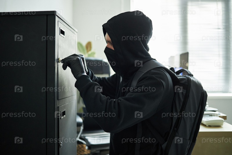Молодой человек, носящий маску Открытие офиса Файловый шкаф ящик с выбором замка