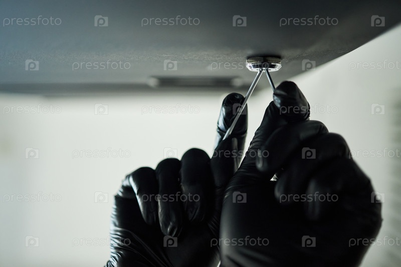 Руки мужского вора, носящего перчатки и выбирающего замок на сейфе в офисе