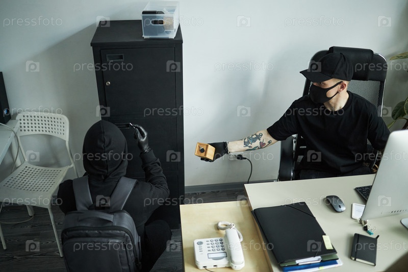 Два молодых взрослых мужчины грабят сейф во время рейда на офис компании