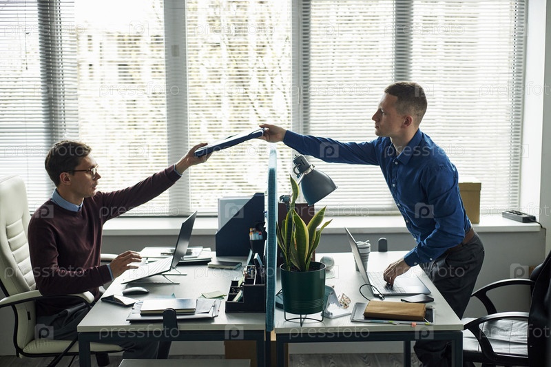Два молодых взрослых мужчины обмениваются документами через офисный стол
