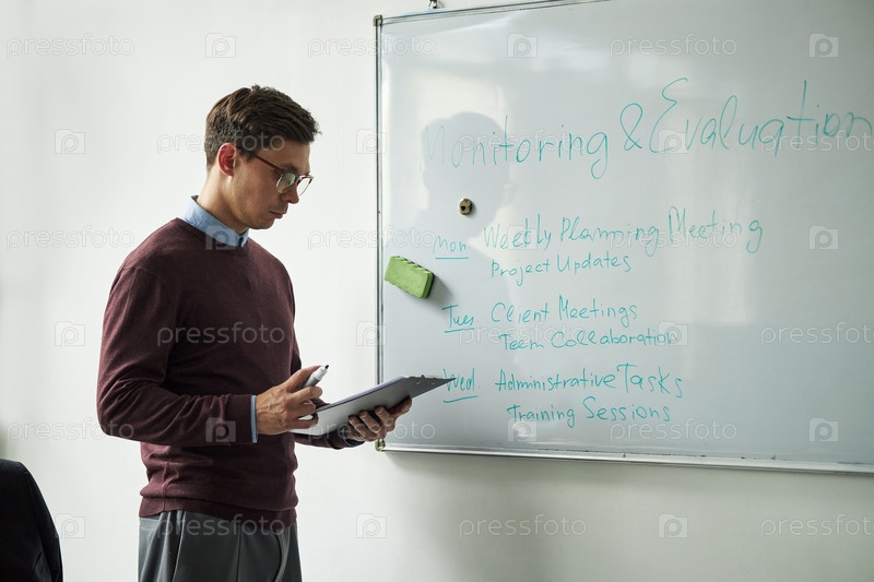 Молодой человек, ведущий деловые встречи, пишет на доске