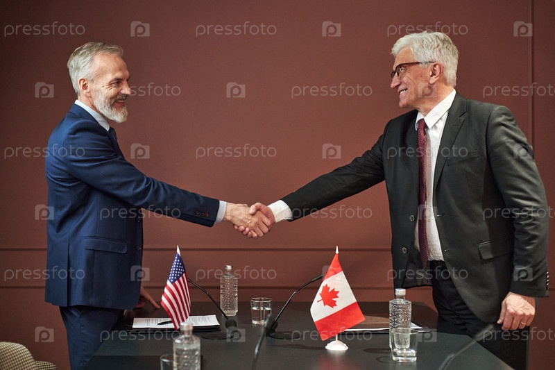 Политики среднего возраста, пожавшие руки во время дипломатической встречи