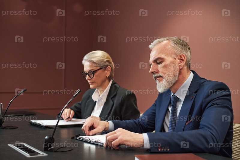 Политики среднего возраста посещают встречи и рассматривают документы