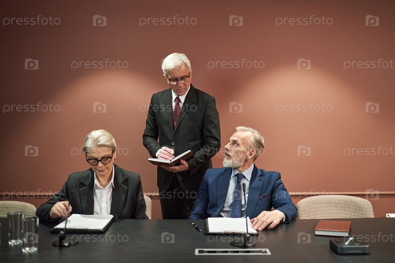 Высокопоставленные политики обсуждают политику, в то время как мужчина средних лет делает заметки