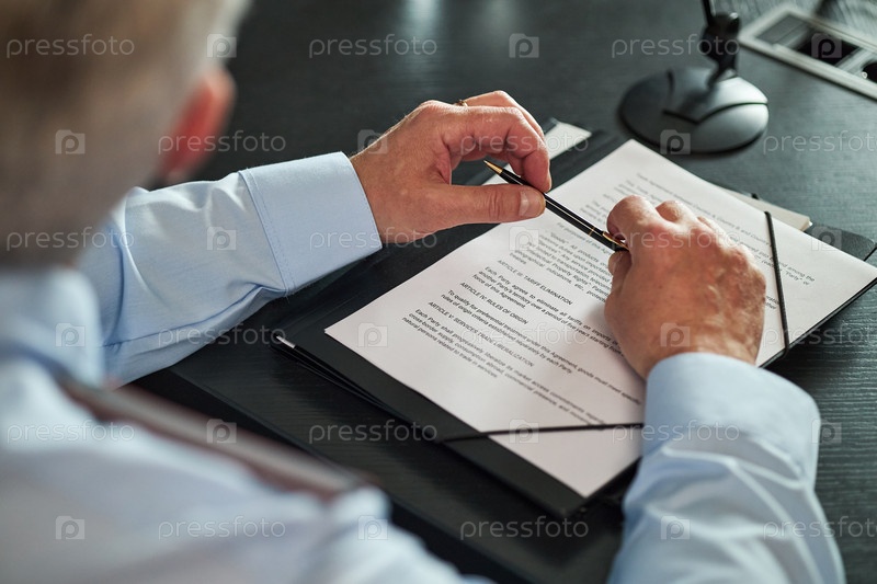 Старший человек просматривает официальные документы во время политической встречи