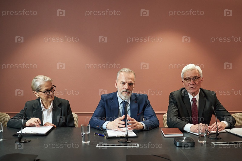 Группа политиков среднего возраста, обсуждающих политику за конференц-столом