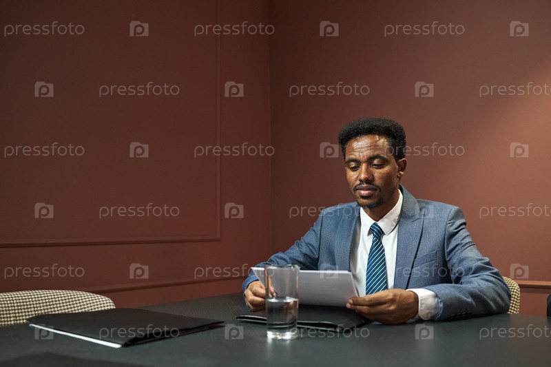 Чернокожий мужчина средних лет читает документы во время политической встречи в помещении