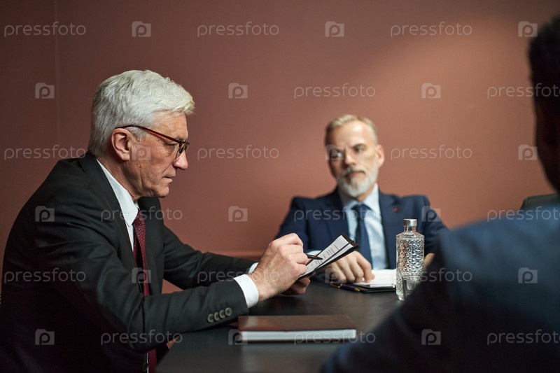 Старшие мужчины обсуждают документы во время политической встречи в помещении